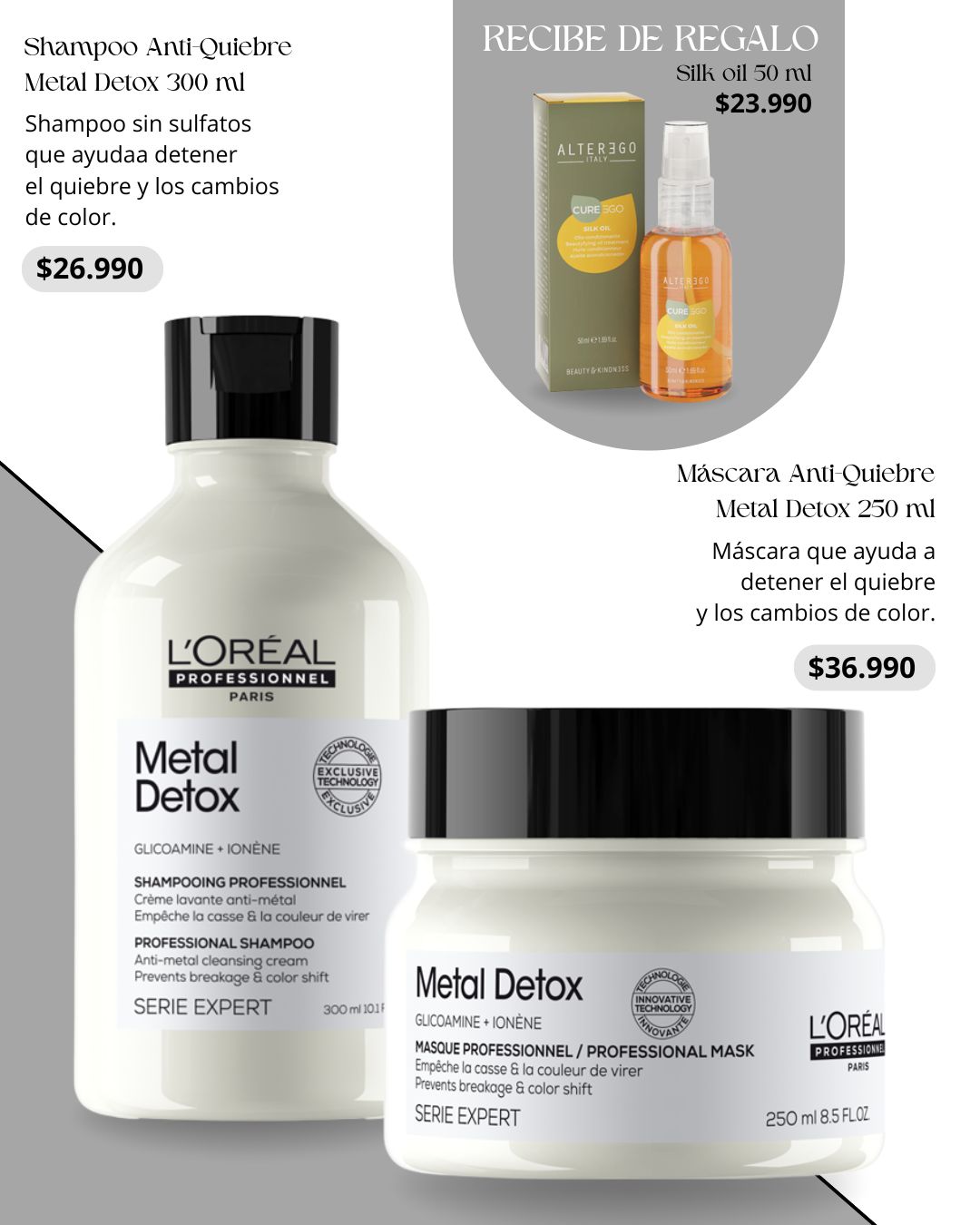 Shampoo Anti-Quiebre Metal Detox 300 ml Shampoo sin sulfatos que ayuda a detener el quiebre y los cambios de color. 💰 Precio individual: $26.990